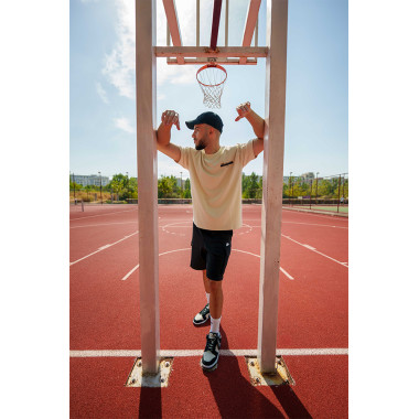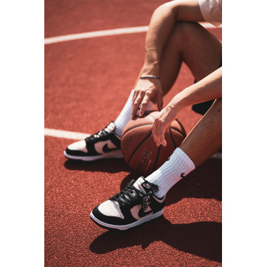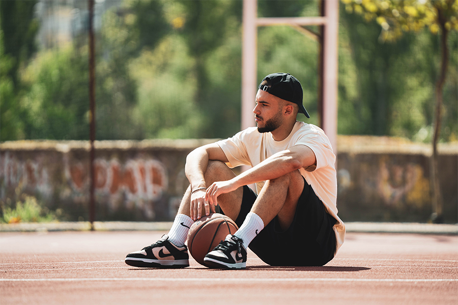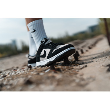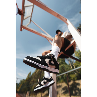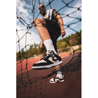 Hej, Matei, këtu. Po e nis historinë time të parë në blog me një pale atlete që nuk mund të të bëjnë të ndihesh më rehat sesa në një fushë basketbolli: Nike Dunk Low Retro SE “Panda-Monium White Black Suede”. Të fotografoja këtë pamje në fushë më dukej perfekte, sepse Dunk lindi në basketboll përpara se të bëhej një ikonë e veshjeve streetstyle, dhe të shkelja në atë dysheme me Panda-Monium ishte sikur të ndërthurja të kaluarën dhe të tashmen me një lëvizje.