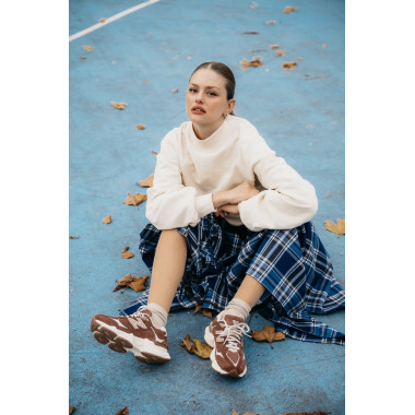 - Për një pamje lifestyle, zgjedh një bluzë oversize, pantallona cargo dhe modelin 9060 – ngjyra shkon bukur me tonet e tokës, dhe pulovra shton një atmosferë komode që të gjithëve na duhet në ditët e ftohta.